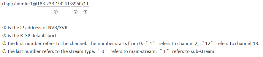 rtsp://user name:password@ip address:rtsp prot/0  main stream